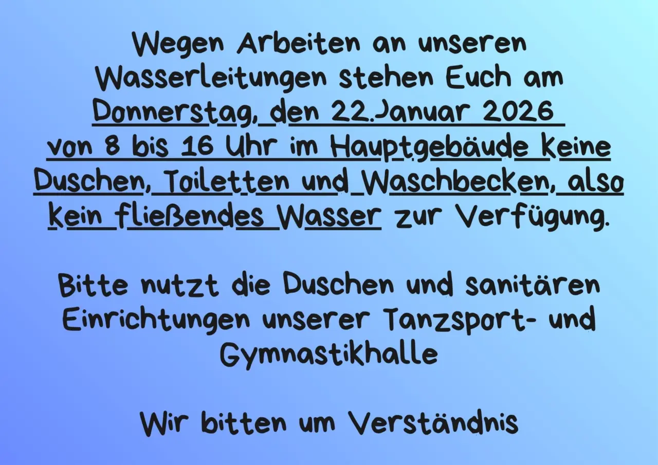 am morgigen Donnerstag, den 22. Januar 2026 steht im Zeitraum von 8 bis 16 Uhr im Sportzentrum wegen Leitungsarbeiten kein Wasser zu Verfügung. Die Nutzung der Duschen, Waschbecken und Toiletten ist dann nicht möglich. Wir bitten Euch in diesem Zeitraum auf die Einrichtungen in der […]