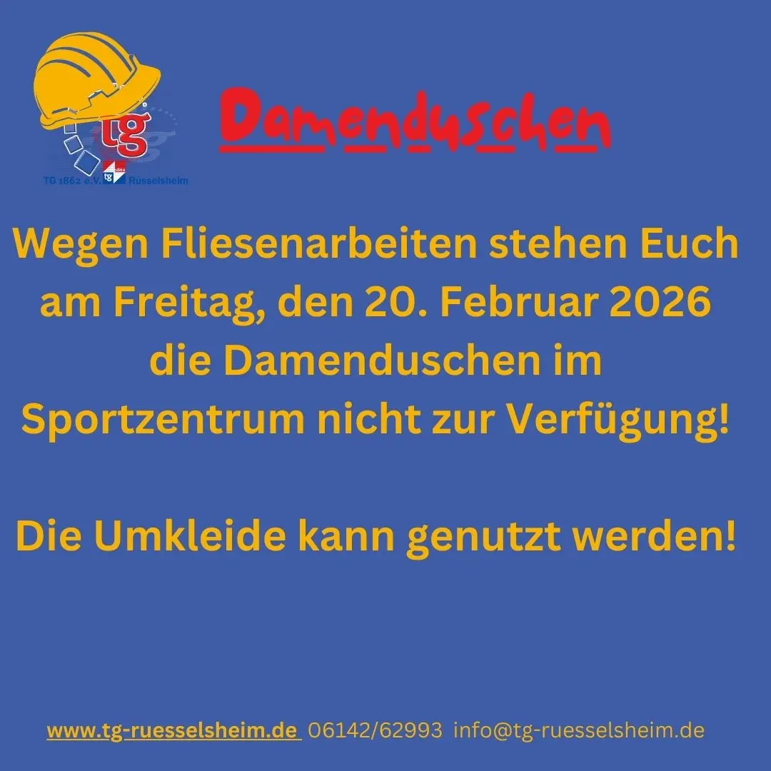 wegen Fliesen- und Sanitärarbeiten stehen Euch unsere Damenduschen im Sportzentrum am morgigen Freitag, den 20. Februar 2026 nicht zur Verfügung. Bitte duscht nebenan bei den Her…, bzw. dann weicht dann doch lieber auf die Damenduschen unserer Tanzsport- und Gymnastikhalle aus.